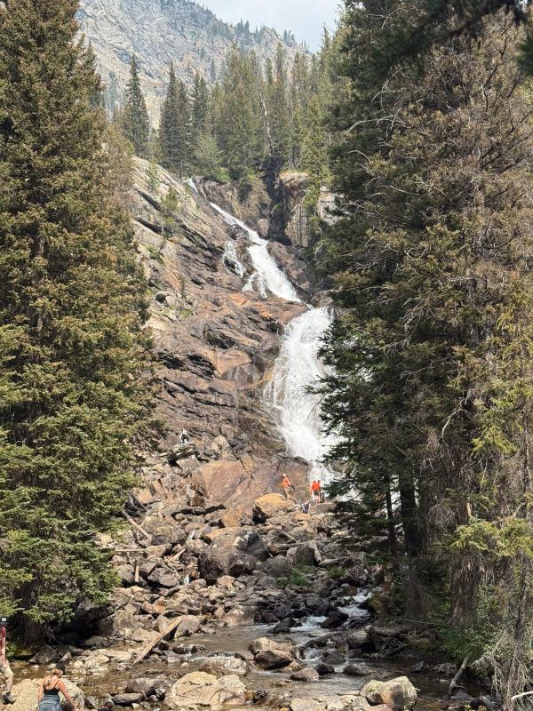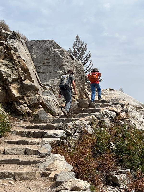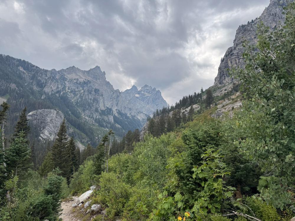 Wir wandern noch ein Stück in den Cascade Canyon hinein. Die Landschaft ist schön, aber es sind weiterhin viele Leute unterwegs. Außerdem hat sich der Himmel wieder verdunkelt. Der Junior erledigt noch eine Aufgabe im Booklet, dann gehen wir über den Horse Trail zum Bootsanleger. Auf diesem Weg ist nichts los, erst kurz vor dem Anleger treffen wir auf andere Wanderer.