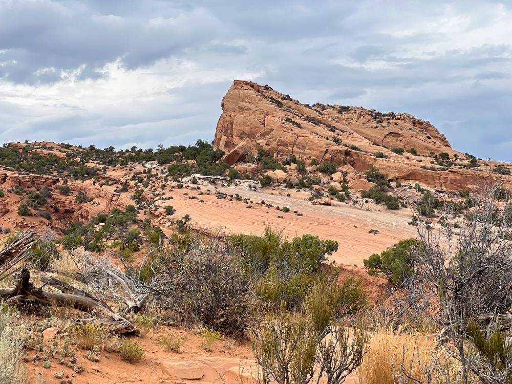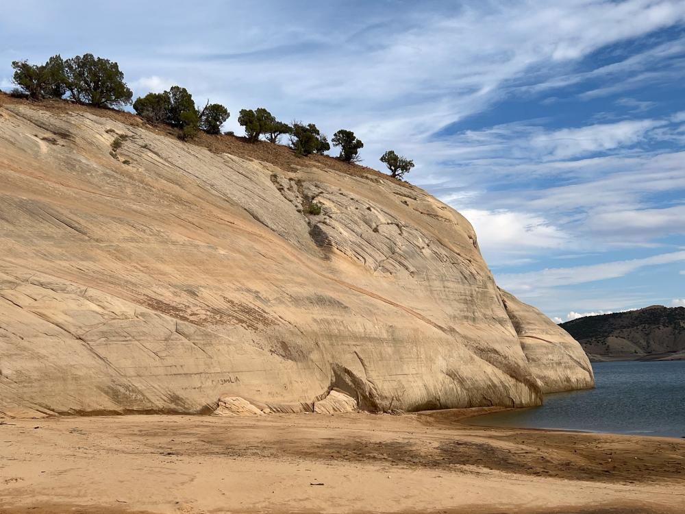 Das Wetter bleibt wechselhaft, es regnet auch mal kurz. Gegen 16 Uhr erreichen wir den Red Fleet State Park. Der dortige Shop und damit auch das Boat Rental hat leider geschlossen. Deshalb fahren wir wieder ein kleines Stück zurück und dann über eine schmale, geteerte Straße zum Parkplatz der Dino Tracks.