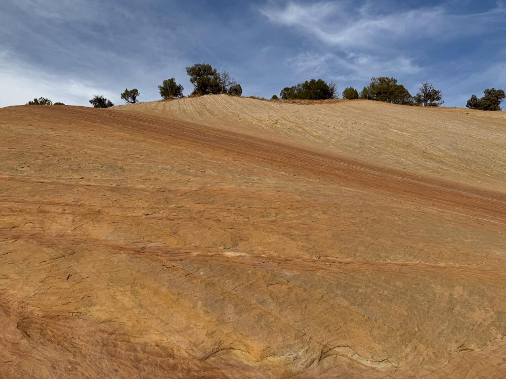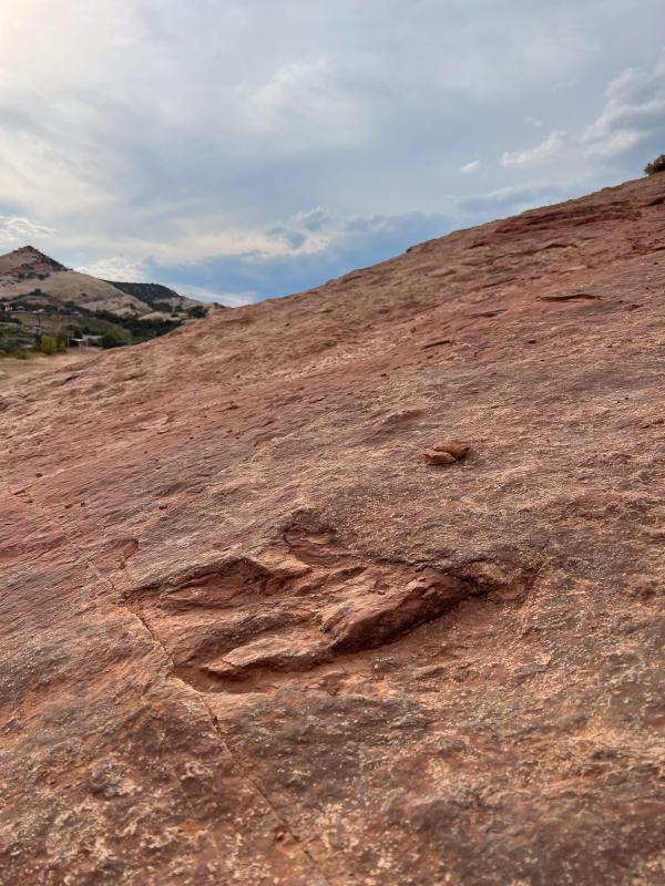 Wir wandern über Slick Rock ca 2km bergab zu den Dino-Spuren. Einige Abdrücke sind eindrücklich groß. Und wenn man weiß, wonach man gucken muss, entdeckt man immer mehr. Wir genießen die wunderbare Landschaft, die uns stark an den Südwesten erinnert und laufen gemütlich zum WoMo zurück.