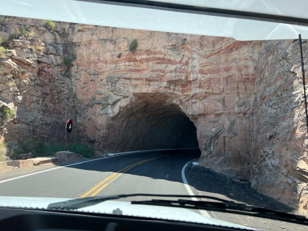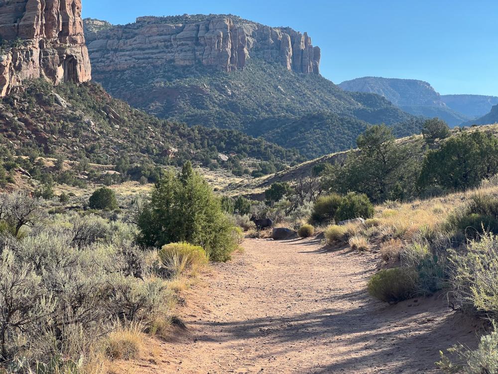 An der Abzweigung überzeugen wir den Junior, noch zu Devils Kitchen zu gehen. Auf dem Weg können wir erst viele Kaninchen, dann ein großes Squirrel beobachten. Dann überquert ein Bighorn Sheep den Weg und erklimmt mühelos die Felswand. Toll!
