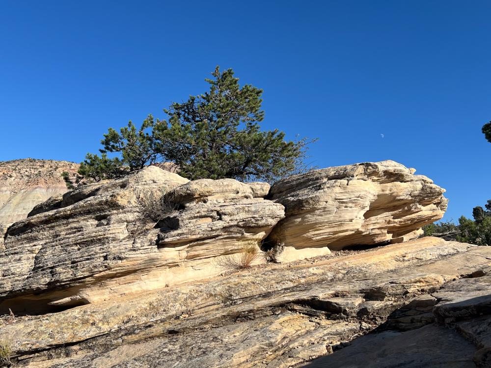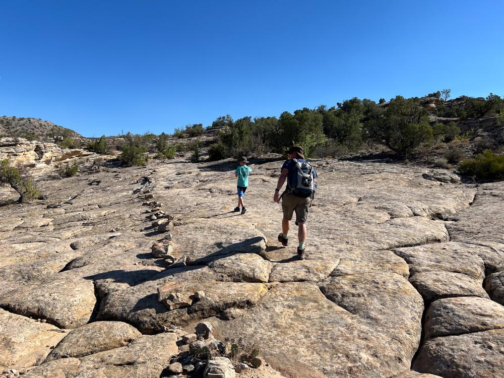 Da es jetzt am frühen Nachmittag recht heiß geworden ist, streichen wir die größere Wanderung endgültig und fahren zum Devils Kitchen Trailhead. Hier nehmen wir den angeblich schattigen Echo Canyon in Angriff. Der Pfad führt aber erstmal teils recht steil bergauf über Slickrock in der prallen Sonne, bevor es wieder bergab in den Canyon geht.