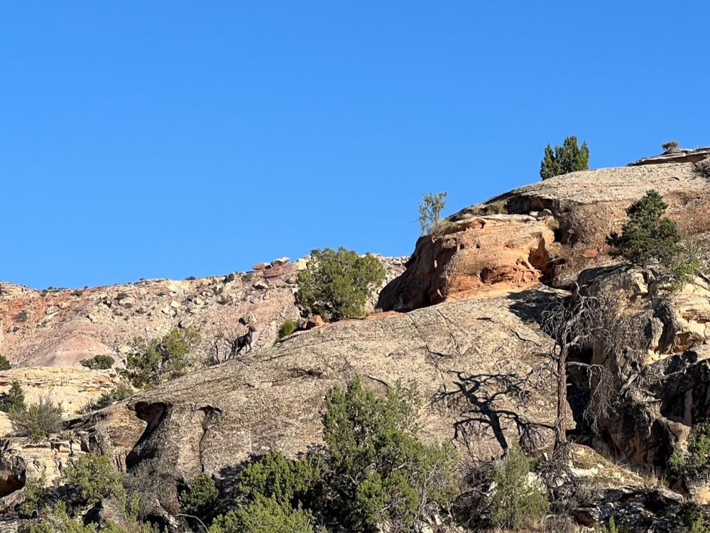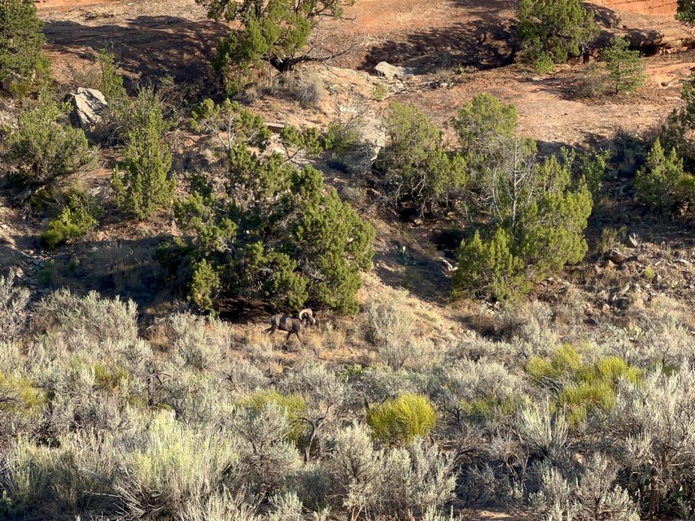 Auf dem Rückweg können wir erneut das Bighorn Sheep beobachten. Es klettert die Felswand hinunter und überquert wieder den Weg, bevor es im Gebüsch verschwindet.