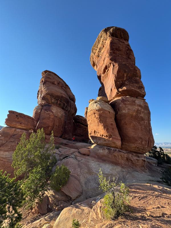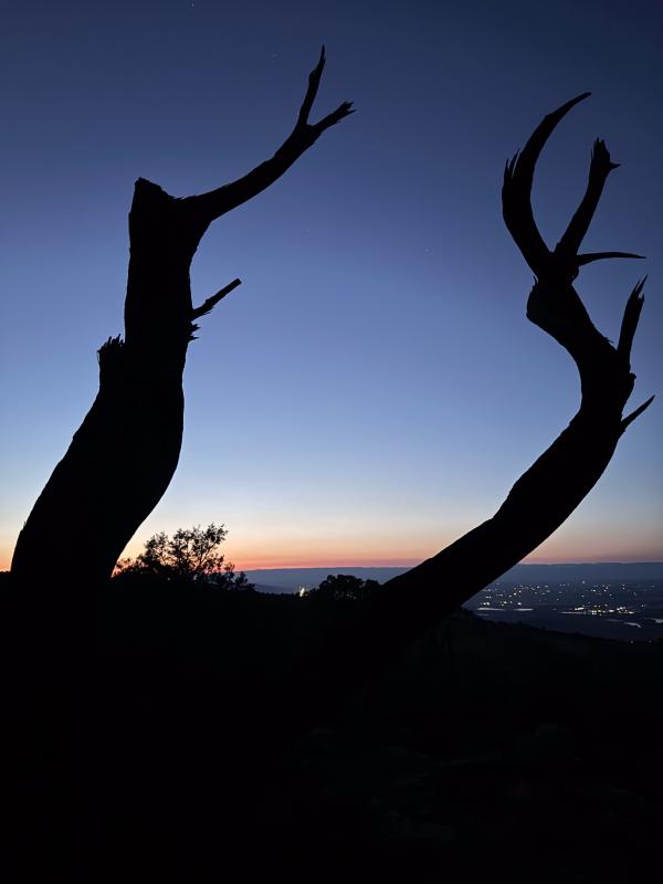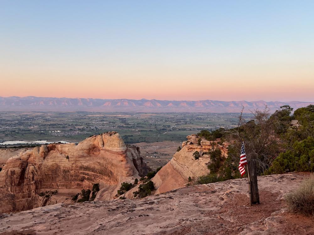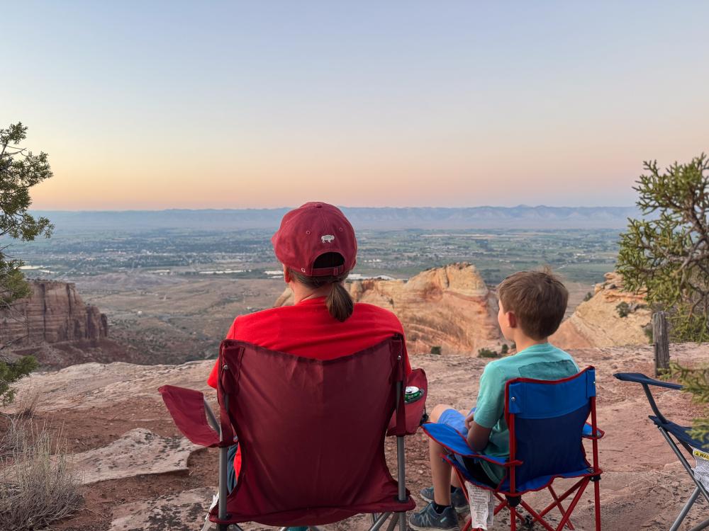 Auf unserer Site schnappen wir uns die Campingstühle und kühle Getränke und gehen das kurze Stück zur Rim Kante. Die Sonne ist leider schon untergegangen, aber der Himmel ist wunderschön. Wir beobachten, wie in Fruita langsam die Lichter angehen. Fledermäuse sausen über den Himmel. Ein sehr wunderschöner, entspannter Moment auf dieser Reise voller vieler schöner Momente.