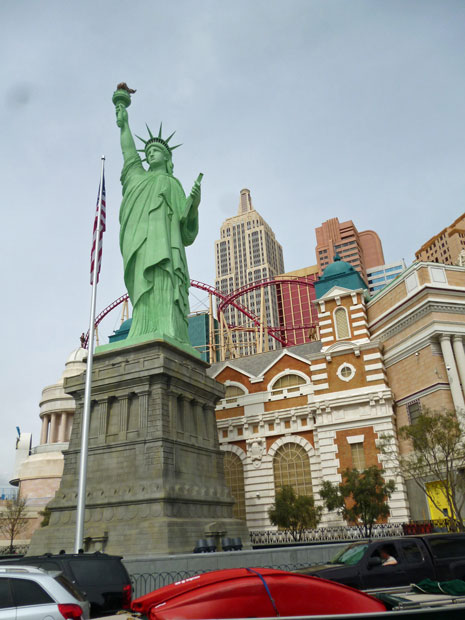 4.4 Überraschenderweise war es hier, mitten in Las Vergas, ruhiger als auf jedem anderen KOA bislang und wir haben gut geschlafen. Die Heizung haben wir nachts auch nicht benötigt, da es warm genug war. Wir frühstücken noch gemütlich fahren dann los. Eine zweite Nacht hier brauchen wir nicht. Wir wollen noch den Las Vegas Boulevard bis zum Ende fahren, denn wir haben festgestellt, dass wir nur ca. ein Viertel der Casinowelt gesehen haben. Los geht’s. Ausnahmsweise freuen wir uns über den zähen Verkehrsfluss, er lässt uns Zeit, alles anzusehen und sogar gelegentlich bei roter Ampel auszusteigen und ein Foto zu schießen – perfekt. Plötzlich kracht es an unserem Womo. Da ist doch die Fahrerin neben uns mit ihrem Kleintruck etwas zu dicht an uns herangefahren, und unsere beiden Außenspiegel sind kollidiert. Es ist nix passiert, der Beifahrer, ein maximal pigmemtierter Mitbürger und wohl Ehemann oder Freund, schaut mich ganz erschrocken an und wirkt sehr erleichtert, als wir ganz lässig reagieren; wir lachen uns an und weiter geht’s. Es gibt hier so viel zu sehen, dass ich versuche, noch irgendwo einen Parkplatz zu finden. Fehlanzeige, so nahe am Geschehen, gibt es nur Parkplätze und Parkhäuser für PKW’s, die zwar gerne mal 12m lang sein dürfen, aber nicht so hoch, wie unser Womo das wir „Steinbeck“ getauft haben.