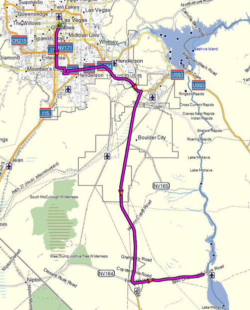 Margit übernimmt das Steuer und wir fahren in Richtung Süden. Wir bleiben bei unserem geänderten Plan, den Rückweg nach Chicago durch den Süden der USA zu nehmen; denn wir haben keine Lust darauf, wieder in die Kälte zu kommen. Wir fahren auf der gut ausgebauten State Road 95 in Richtung „Bullhead City“, und dann in „Searchlight“ ab auf die Country Road 164 in Richtung „Lake Mahove“, einem weiteren Stausee der durch einen Staudamm des Colorado gebildet wurde. Eigentlich ist der Colorado gar kein Fluss mehr, sondern nur noch eine Folge von Stauseen. Dadurch hat sich zwar ein riesiges Erholungsgebiet entwickelt und an den Staudämmen wird Strom erzeugt für die umgebenden Städte und Dörfer. Aber, ein „normaler“ Fluss ist das nicht mehr.