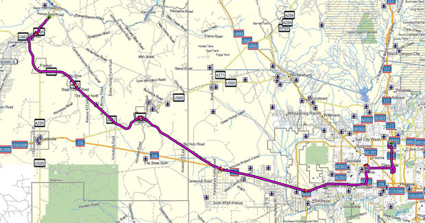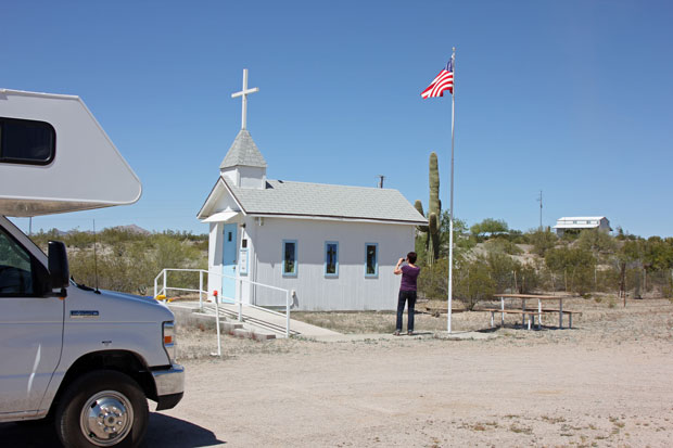 6.4 Es war recht ruhig heute Nacht. Wir stehen gegen 8:00 auf, draußen ist schon einiges los. Es gibt Frühstück wie üblich, und dann ist abbauen angesagt. Ein Nachbar in einem RV hilft mir mit seiner Wasserpumpenzange aus, gemeinsam kriegen wir den Wasserhahn von meinem Wasserschlauch ab. Das spart das Geld für eine zweite Zange, die ich sonst hätte kaufen müssen. Es geht los in Richtung „Parker“, und dann nach Osten in Richtung „Phoenix“, über „Boost“, den kleinen Ort „Salome“, wo wir tanken und uns ein mitteilungsbedürftiger, netter, amerikanischer Motorradfahrer sein Leben erzählt und von seiner schönsten Motorradtour schwärmt, die er mit fünf Deutschen, einem Australier und zwei Schweden mal gemacht hat. Macht nix, wir haben viel Zeit zum Zuhören.
