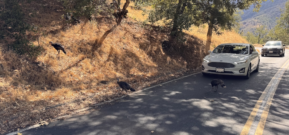 Auf der SR-198 ging es wieder Richtung Süden, in der Hoffnung doch noch ein wenig Wild Life zu sehen, aber nichts, es tat sich einfach nichts..., aber haaaalt stop, da waren dann doch noch ein paar Truthähne als Ausgleich der fehlenden Bären