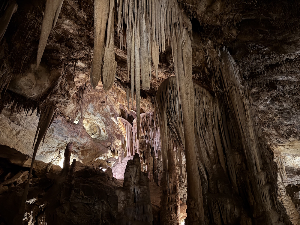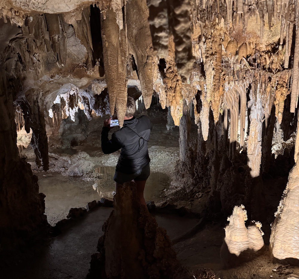 Dann schließlich wurde die Schuhe dekontaminiert (wegen einer Krankheit der Fledermäuse) und schon ging es durch die Luftschleuse in die doch kühle Höhle. Der Gang war ein echtes Erlebnis mit tollen Erklärungen der Rangerin. Auch wurde das Licht hier für ein paar Minuten ausgeschaltet