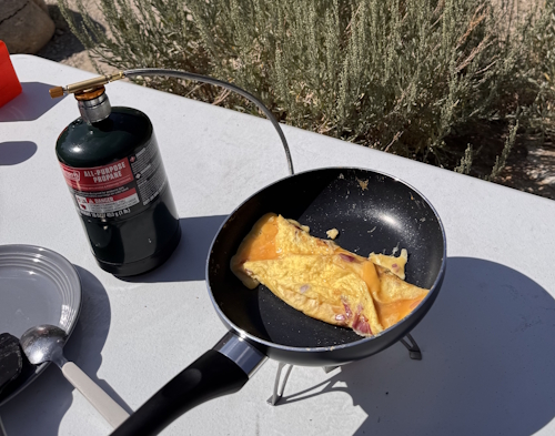 …wir hatten prächtig geschlafen, ließen uns heute morgen auch wirklich Zeit. Frühstück im Freien bei bestem Wetter, da gibt es heute doch glatt ein Omelett dazu.