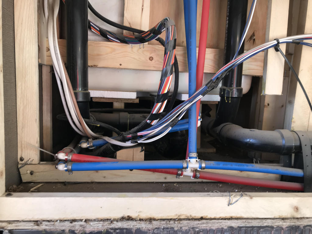 Wir schraubten also erst einmal das Brett unter dem Bett los, jedoch ließ sich der Fehler hier nicht lokalisieren. Also krochen wir in den Keller und schraubten hier die Verkleidungen los und die Wasserleitungen kamen zum Vorscheine. Mit der Taschenlampe sahen wir dann auch die Leckage. Wir konnten den Keller wieder verlassen und schraubten an der Außenwand den City-Water-Connector ab. Auf der Rückseite hatte sich der Schlauch gelockert, den wir wieder ordentlich festschraubten und schon war der Kieslaster wieder trockengelegt, wunderbar
