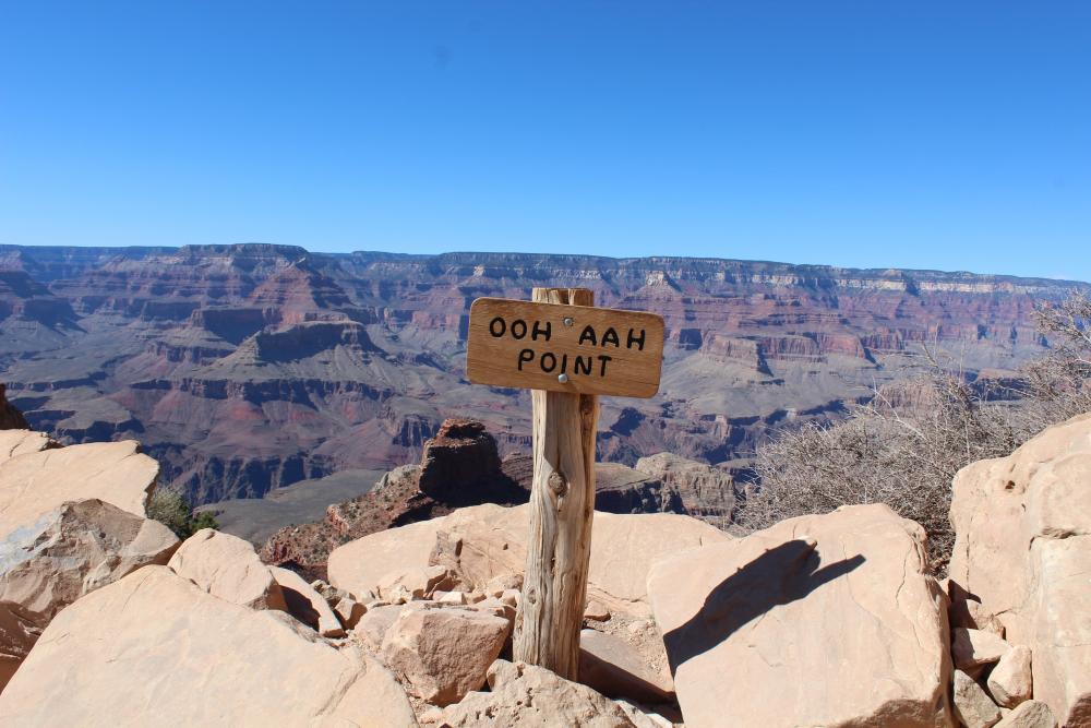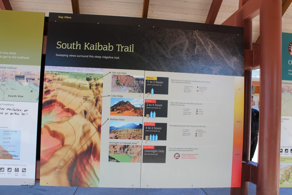 Wir steuerten erstmal zum Besucherzentrum und schauten uns erstmal dort um. Wirklich hilfreich waren dort die Hinweise für die verschiedenen Trails mit genauer Länge der Trails und Schwierigkeitsgrad. Nachdem wir uns den Kaibab Trail für den heutigen Tag, und den Bright Angel Train für morgen ausgeguckt hatten, gingen wir zum Fuß zum Mather Point, um einen ersten Eindruck vom Grand Canyon zu gewinnen. Ein wirklich demütig-machender Ausblick.