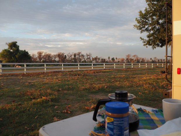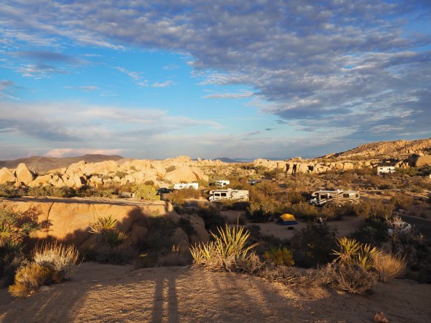 Der Jetlag weckt uns um 06:30 Uhr. Damit sollten wir an einem Samstag doch sicher die ersten auf dem Platz sein – denken wir... Falsch gedacht. Die Nachbarn grillen, angeln und wandern bereits los.. Wir frühstücken in Ruhe bei Sonnenaufgang und machen uns gegen 07:30 auf den Weg zum Joshua Tree Park.