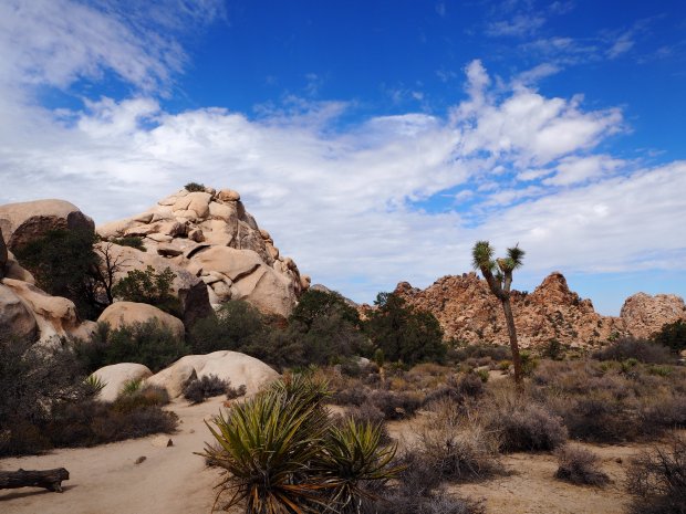 Wir halten gegen 10 Uhr im Besucherzentrum an der Einfahrt des Joshua Tree Parks. Der nette Ranger gibt uns Tipps für unseren Besuch. Wir starten mit zwei kleinen Wanderungen ins Hidden Valley und zum Barker Dam (jeweils ca. 30 min) und fahren zum Keys View auf 1581m. In der Nacht hatte es geregnet und wieder sind Wolken am Himmerl. Für uns und unsere Wanderpläne ist das aber Gold wert. Am Jumbo Rocks suchen wir uns gegen 14 Uhr den schönsten Campground aus. Trotz First Come, First Serve am Samstag waren genügend Plätze frei. Nach kurzer Mittagspause (Regen in der Wüste!) im Wohnmobil erkunden wir den Platz und laufen, bzw. klettern den Skull Trail.