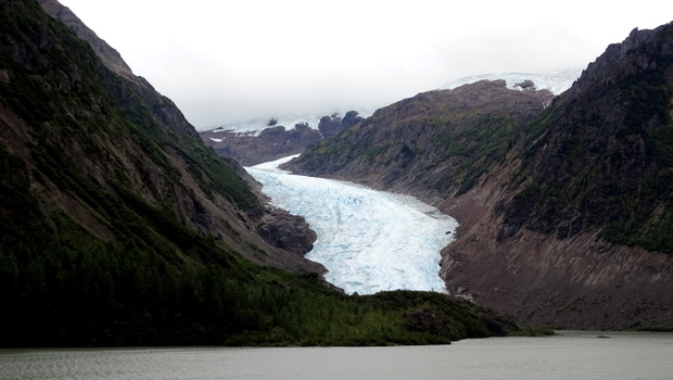 Campground Host erzählt das das Wetter so bis zum Ende des Monats bleibtWir fahren auf dem Stewart Hwy Richtung Hyder.!Hmm,anstatt hoch geht die Temperatur immer weiter runter.Ein kurzer Stop am Bear Glacier-es regnet und ist sehr windig.