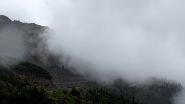 Vorbei an der Bear Viewing Area geht es auf der Salmon Glacier Road hoch zum Gletscher.Das Wetter ist mittlerweile richtig schlecht.Wir haben nur noch 6°C und es regnet.Die Strasse ist schmal,aber es gibt ab und an Stellen zum ausweichen.Nervend sind die zahlreichen 'Pot Holes'.Aber wenn man langsam fährt kein Problem.