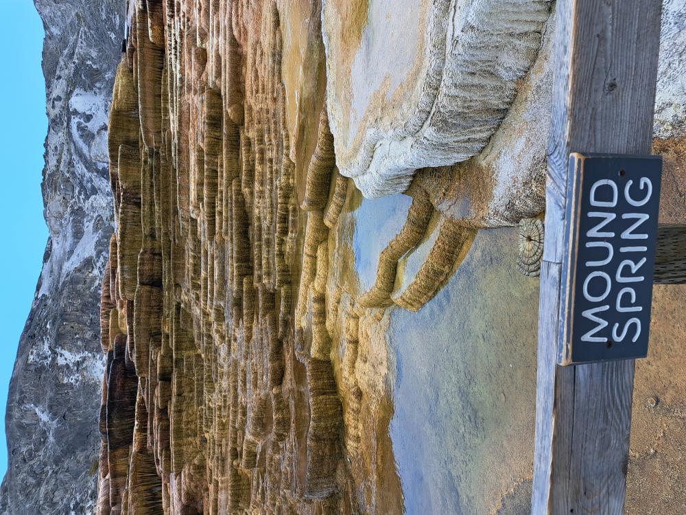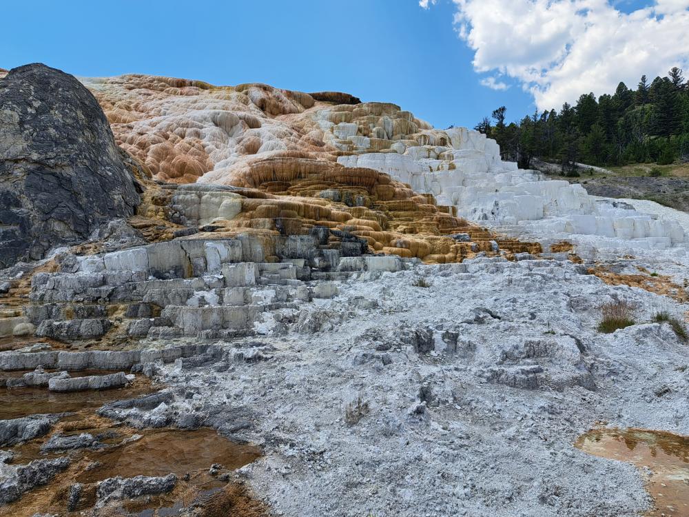 Gebirgsstraße mit tollen Ausblicken. Man darf die benötigte Zeit nicht unterschätzen. Wir hatten am Campground eine Karte bekommen wo auch die Fahrzeiten drauf standen und für die 19Meilen bis Tower Rossevelt stand da eine Stunde, das hätte ich so nicht eingeschätzt. Am Ende war da dann noch eine Baustelle und wir brauchten noch länger. Wir machten dann einen kurzen Stop beim Tower Fall und wollten dann beim Petrified Tree halten, aber dort waren RV´s auf der Zufahrtstraße leider wie des Öfteren verboten. Dann sind wir weiter nach Mammoth Hot Springs. Der Ort ist nicht groß aber wieder ein Touri Hotspot. Das Visitor Center war ganz gut. Dort gab es auch Wifi aber das Internet war schwach und dazu noch voll überlastet, sodass wir nicht mal alle Whats Apps rausbekommen haben. Dann sind wir zu den Hot Springs Terassen gelaufen und einige der Broadwalks gegangen. War schon schön anzusehen und wieder mal etwas besonders was die Natur da geschaffen hatte.