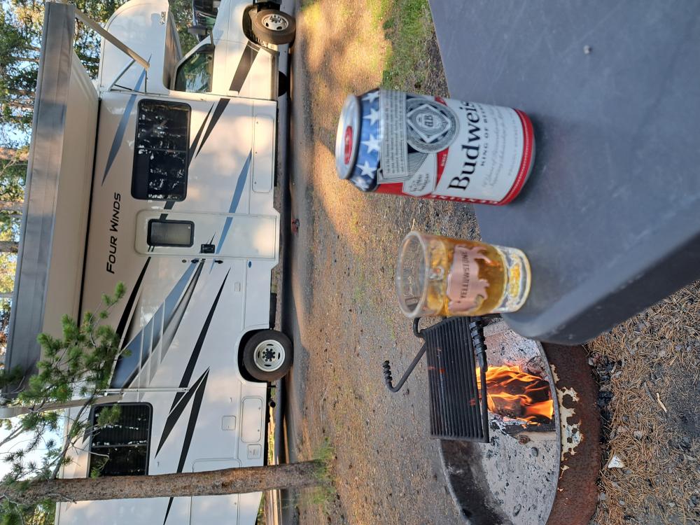 Auf dem Rückweg holten wir uns noch ein Eis und fuhren anschließend weiter. Die Strecke von hier bis Norris Geysir Basin war sehr schön. Auch ein paar Bisons konnten wir wieder sehen. Nach einigen Stops kamen wir gegen 15.30Uhr zum zweiten Mal am Madison Campground an. Nach dem einchecken gingen wir runter zu der Flussmündung und kühlten uns ein bisschen ab. Der kältere der beiden Flüsse war eigentlich bei den ca. 30°C der angenehmere. Wir gingen auf dem Rückweg nochmal an einer anderen Stelle in den Fluss bis ich am Grund eine kleine Schlange entdeckte, da traten wir schleunigst den Rückzug an. Wahrscheinlich war Sie nicht gefährlich aber wir haben für solche Tierchen eben nichts übrig. Zurück an unserer Site machten wir ein kurzes Päuschen und gegen 18Uhr das Lagerfeuer an um unsere selbst eingelegten Rippchen darauf zu Grillen. Wir saßen dann noch bis 22 Uhr am Feuer, beobachteten das treiben und genossen den warmen Abend. Achja und unsere neuen Yellowstone Schnapsgläser weihten wir standesgemäß mit Yellowstone Whisky ein.![]()