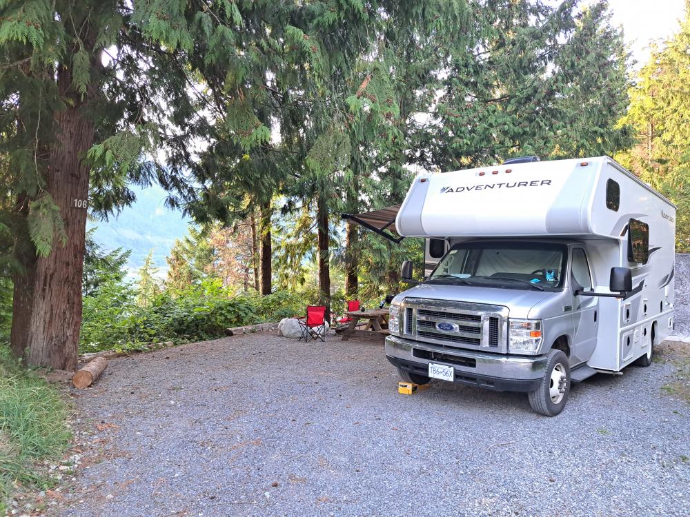 Leider durften wir kein Feuer machen. Unsere Site hatte keine Hook Ups was ich bei der Buchung nicht als Problem gesehen hatte, was mir aber völlig entgangen war viel uns erst beim einchecken auf, denn es gab keine dump Station und das obwohl es etliche Sites mit Full Hook Up auf dem Platz gab. Deswegen bin ich wahrscheinlich auch garnicht darüber gestolpert das es keine Dump Station gab. Auf dem Zettel den wir bekamen war dann nur der link zur Website Sanidumps.com wo viele dump Stations in der Nähe eingezeichnet waren. Problem ist nur immer das man nicht weiß wie aktuell und gepflegt diese Seiten sind. Am Ende entschieden wir das es das sicherste sein wird 10km nach Squamish zurück zu fahren, denn der dortige Canadian Tire hatte eine Dumping Station das konnten wir dann auch auf deren Website kontrollieren. Das hat mich dann doch ein wenig geärgert, denn wir hatten ja auch noch 130km bis Abbotsford zu fahren. Naja ist eben manchmal so und das ist eben Zeit die man immer einplanen sollte.