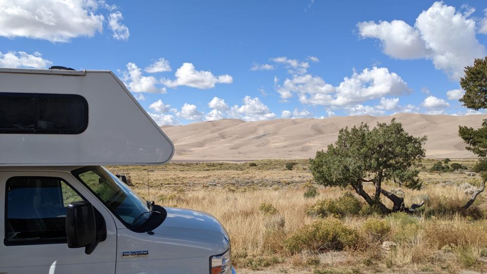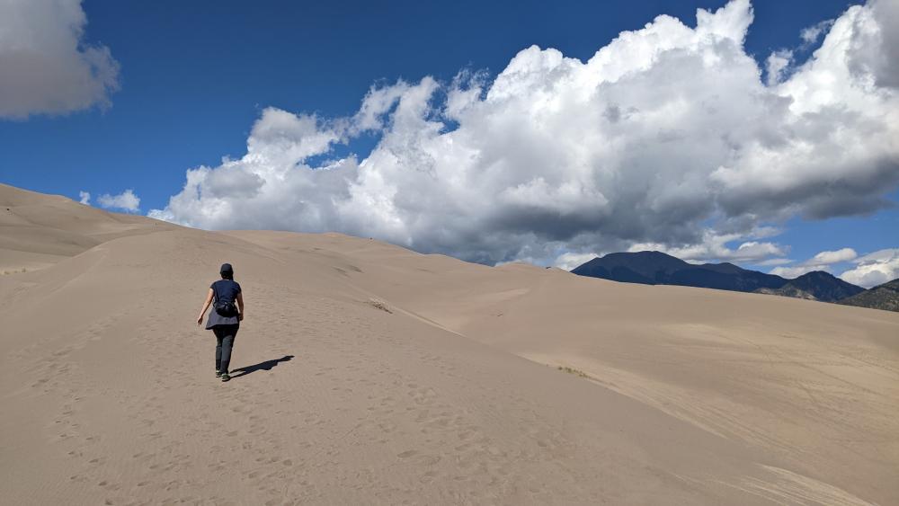 Unser letztes grosses Ziel ist mal wieder so richtig cool. Die riesigen Sanddünen mit den teilweise bereits leicht schneebedeckten Bergen im Hintergrund sind ein wirklich tolles Erlebnis. Wir verbringen zwei Nächte im Nationalpark auf dem Pinon Flats Campground. Am Tag der Ankunft können wir aufgrund des starken Windes leider noch nicht allzu weit in die Dünen rein. Am zweiten Tag erwischen wir aber nochmals Traumwetter und erklimmen die Dünen bis ganz oben. Der Aufstieg ist zwar anstrengend (ca. 250 Höhenmeter), aufgrund der Beschaffenheit des Untergrunds ist das vorwärts kommen aber lange nicht so schwer wie in "normalen" Sanddünen. Richtig trocken und weich ist immer nur die oberste Schicht des Sandes. Alles unterhalb weniger Zentimeter ist feucht und kompakt. Aufgrund dessen kann sich der Sand sich hier zu riesigen Dünen auftürmen.