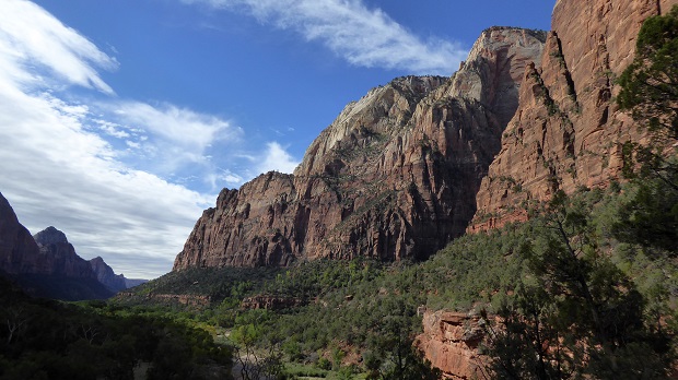 Es ist bewölkt und mir ist nicht ganz wohl heute Morgen. Die vermutlich anstrengende Wanderung zum Observation Point streichen wir und fahren mit dem Shuttle Bus zur Haltestelle The Grotto. Hier beginnt unsere Wanderung zu den Emerald Pools. Auf dem Kayenta Trail ist nicht viel los und wir geniessen die schönen Ausblicke ins Zion Tal und auf den Virgin River. Die Pools selbst finden wir nicht so toll und wandern über den Lower Emerald Pool Trail zurück. Nachdem wir den River überquert haben, sehen wir uns noch bei der Zion Lodge um. Ein altehrwürdiges Hotel das den Charme der 20er Jahre ausstrahlt. Auf der Wiese davor sitzen einige Schulklassen und machen Pause.