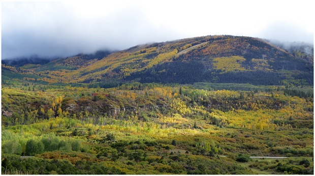Wir laufen noch zum Spruce Tree House runter und sehen uns die Gebäudeteile von nahem an. Der Weg ist geteert und gut zu gehen. Da das Wetter noch nicht besser geworden ist, beschließen wir am CG via W-Lan den Wetterbericht für die nächsten Tage zu checken. Da sieht jedoch nicht gut aus. Regnen soll es und wir weichen von unserer geplanten Route deutlich ab. Statt weiter Richtung Osten Durango, Million Dollar Hwy zu fahren geht es für uns in die entgegengesetzte Richtung. Zurück nach Utah. Dort soll das Wetter besser sein und wir fahren direkt zum Canyonlands National Park. In Monticello biegen wir nicht rechts ab, sondern links und fahren die schöne Forest Road 101 die Berge hinauf. Hier oben erwartet uns bereits der Herbst mit seinen Farben.