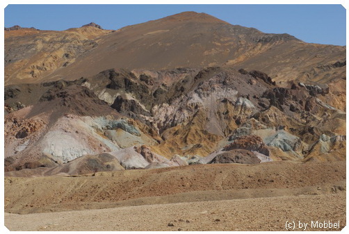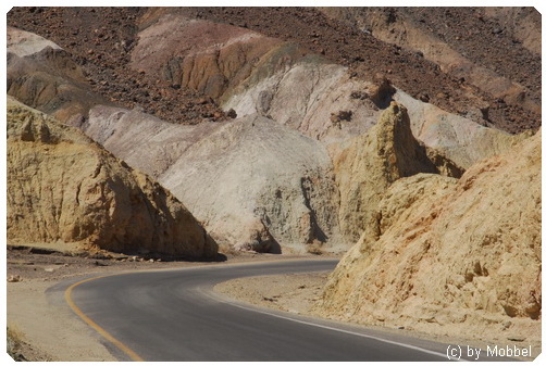 Jetzt wartet der wunderschöne Artists Drive auf uns. Eine One Way Strasse windet sich den Berg hoch durch farbenprächtige Felsen, die Strassenführung ist abenteuerlich, über Kuppen, durch Senken, scharfe Kurven. Hier gefällt es uns besonders gut.