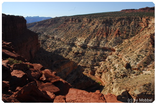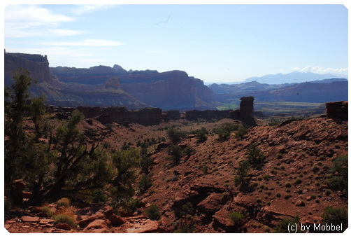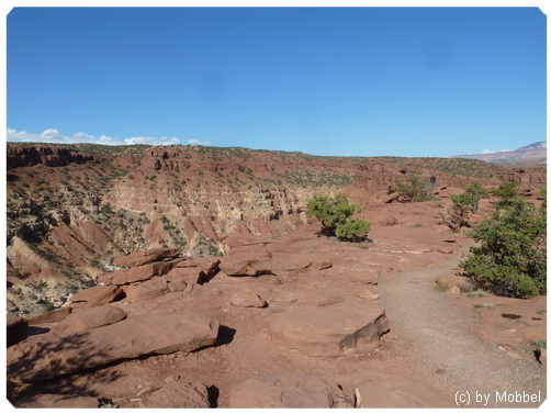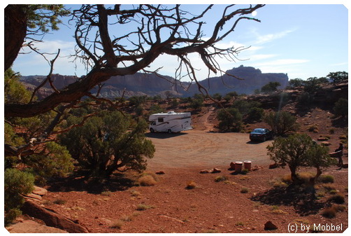 Wir fahren zum Capitol Reef Nationalpark. Da die Füße noch von gestern weh tun, ist an wandern nicht zu denken. Der erste Stop ist der Panorama Point. Von hier geht eine 1 mile gravel road weiter zum Goosenecks Overlook und zum Sunset Point. Nix für uns, aber was sehen wir da? Da kommt der PAPA die gravel road hochgeschnauft, obwohl da 27 feet max steht! Wenn der kann, können wir auch! Das Sträßchen ist auch problemlos zu befahren und plötzlich sind wir fast alleine, während man am Panorama Point schon Gedränge hatte. Es sind alles ganz nette, aber nicht umwerfende Aussichtspunkte.