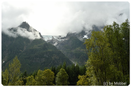 Ab und zu - aber eher selten und nur auf kurzen Abschnitten, ist die Strasse für Gegenverkehr zu eng, dann gibt es aber Ausweichstellen. Die Strasse geht stetig bergan, auf der einen Seite der Berg, auf der anderen der Abgrund. Dieser ist aber meist durch Gebüsch verdeckt, wir sind froh, wenn es mal lichter oder gar nicht da ist, damit man mehr Aussicht auf das Tal und die Gletscherzunge hat. Ich wundere mich nur, das manche Fahrzeuge zum Ausweichen so nah an den Abgrund fahren, als ob es da ein befestigtes Bankett hätte – hat es nicht und sieht bei näherem hingucken auch nicht ganz so vertrauenserweckend aus.