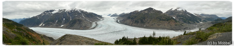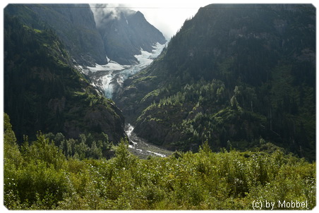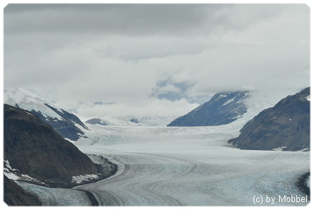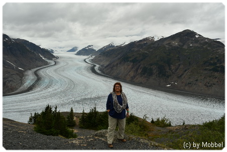 Auf der Strecke nach Stewart sieht man schon die Gletscher auf den Bergen liegen, da es mittlerweile stark bewölkt ist, ist die Strecke nach Stewart jedoch recht finster und trotz der beeindruckenden Landschaft bei uns nicht in allerbester Erinnerung. Am Bear Glacier fällt uns mal wieder auf, wieviele Touristen hier noch unterwegs sind, alle paar Minuten trifft ein weiteres Womo oder Wohnwagengespann ein, um die Gletscherzunge abzulichten.