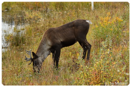 Im Stone Mountain Provincial Park hatten wir uns Stone Sheep erhofft, aber ausser auf Warnschildern haben wir keine gesehen, auch nicht bei „The Cut“, wo angeblich ihr Lieblingsrevier ist. Zum Trost gibt es am Summit Lake ein paar Karibus, kaum steht einer am Strassenrand und fotografiert, gesellen sich schnell weitere Fotografen hinzu. Wobei die später Ankommenden schon mit dem Auto so nah wie möglich ran fahren und sich auch nicht scheuen den Tieren zu Fuß nachzustellen.