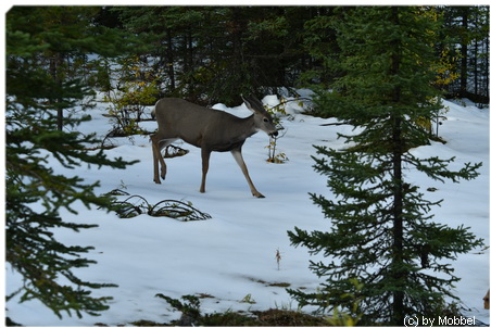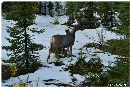 Nun habe ich eine lange Liste, was man hier alles machen kann – ratet was wir machen? Nochmal zum Maligne Lake fahren. Elche suchen. Und wir finden sie. Können 3 Elche am Medicine Lake lange beobachten. Ein Bulle, eine Kuh und ein fast ausgewachsenes Kalb. Der Bulle jagt die Kuh und das Kalb – röhrt dabei gewaltig - wilde Elchjagd!