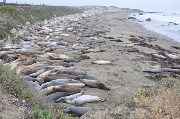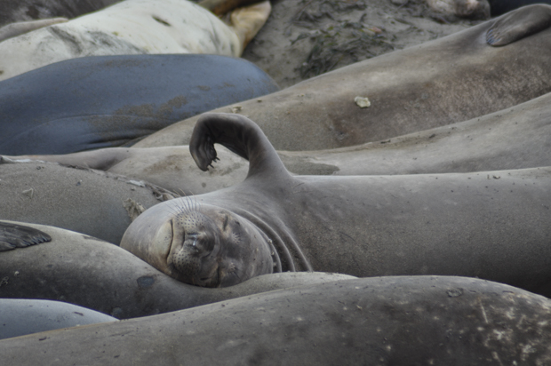 Wir hatten heute wieder eine erstaunlich gute Nacht, sind um 07:00 Uhr aufgestanden, haben vom Bett aus Häsli auf unserer Campsite bestaunt, gefrühstückt und sind dann losgefahren. Dieser Abschnitt des Hwy 1 ist wirklich sehr kurvenreich. Es gibt angenehmeres mit dem WoMo. Bei Point Piedras Blancas legen wir einen Stopp ein und bestaunen die vielen, dicht aneinander gereihten Robben, Seelöwen und Seeelefanten. Die haben sich alle so gern und das finden wir schnusig. Wir schauen lange zu wie sie sich mit Sand einstauben, schimpfen, wenn einer über alle anderen drüber robbt oder sie sich in der Brandung räkeln.