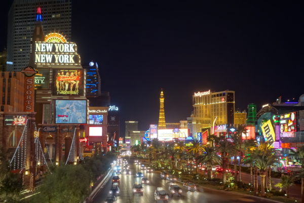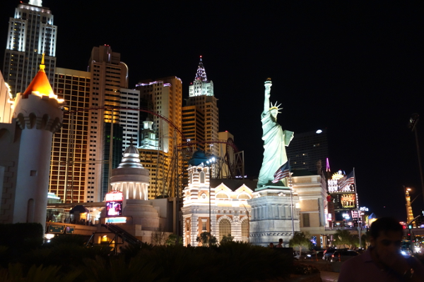 Wir durchqueren die riesige Halle und steigen in den Bus, der uns zum Strip bringen soll. Es geht durch einige gruselige Ecken von Las Vegas, wo kein einziges Licht brennt, gut das wir hier nicht aussteigen müssen. An diesen Ecken steigen auch Menschen mit Waffe am Gürtel ein. Uns wird ein bischen mulmig, haben wir doch sowas vorher noch nicht gesehen und sind es gar nicht gewohnt, dass jeder einfach so eine Waffe mit sich rumtragen kann. Wenn man sich die dunklen Ecken anguckt, dann kann ich es aber verstehen.