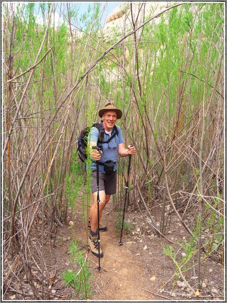 Kurze Besprechung – jawohl, wir machen die große Runde. Also ging es weiter auf schönem Weg zur Owachomo Bridge. Unten am Flußlauf ging dann nicht immer. Hier führt der Weg oberhalb entlang. Und seit den Franzosen haben wir keine Menschenseele mehr gesehen. Schön einsam hier!
