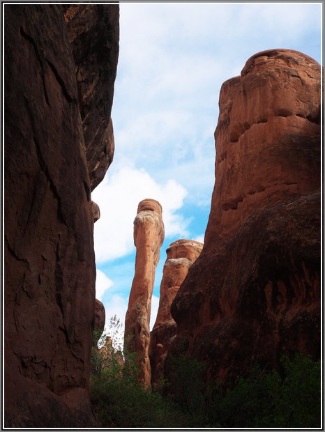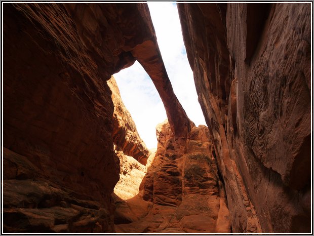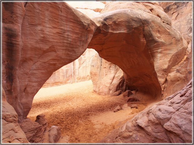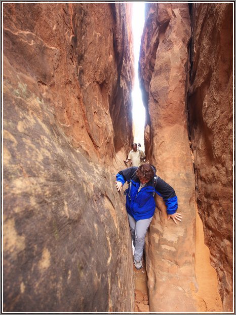 Ein kurzes Wegstück weiter erkläre ich Inge, dass wir in die zweite Felsenspalte wandern müssen. Dort hinten kommt der Sanddune Arch. Inge wollte es mir zunächst nicht glauben.