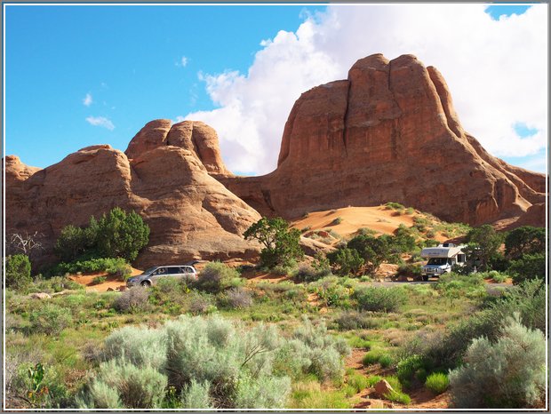 So, ca. 16 Uhr am Parkplatz zurück. Bei Kaffee und Muffins überlegten wir uns, was wir heute noch machen wollen. Inge wollte gerne den Trail am Campground gehen und der war so schön, dass ich diesen auch gerne noch ein zweites Mal gehe. Außerdem wollten wir noch ein wenig unseren tollen Stellplatz genießen. Also auf Richtung Campground. Am Parkplatz zum Sanddune Arch ein Stop, den Arch wollte ich Inge auf dem kurzen Weg zeigen.
