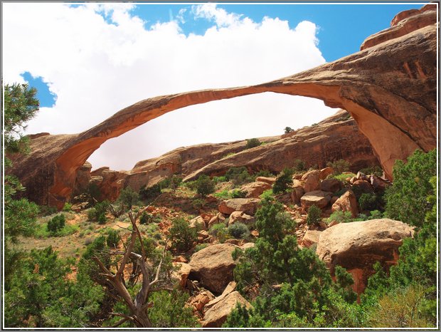 So, jetzt aber zum Landscape Arch, der sich beim Rückweg im besseren Licht zeigte. Gewaltig spannt sich dieser Felsenbogen über 92 m. Am 1. September 1991 brach ein großer Felsblock aus der Unterseite des Bogens. Seitdem ist der Weg unter den Felsbogen gesperrt und der Bogen an seiner dünnsten Stelle weniger als 3 m dick. Wie lange wird dieser Bogen noch halten?