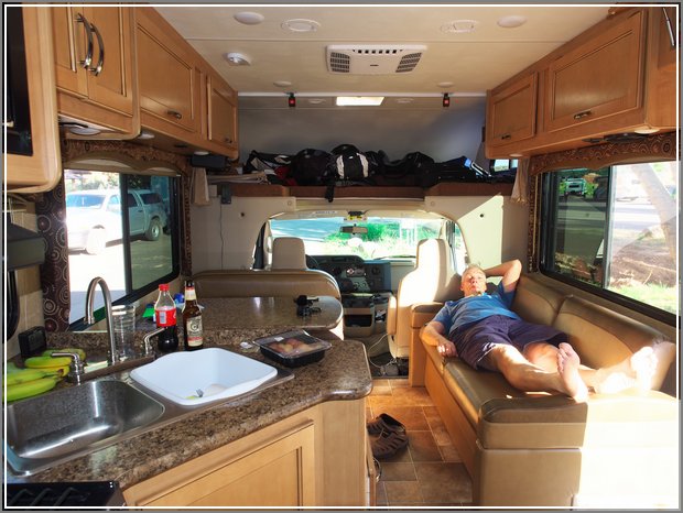 Ich wollte das Wohnmobil unbedingt noch etwas einräumen, Ordnung schaffen. Der Inhalt von vier Reisetaschen musste schließlich vernünftig im Wohnmobil verteilt werden. Das war auch relativ schnell erledigt, Platz ist im Wohnmobil genügend vorhanden. Dann zu Fuß ins nahe gelegene Amanda’s Fonda (www.amandafndas.com) zum Abendessen. Und da war ich dann schuld, denn gerade vor 5 Minuten hatte die Küche geschlossen und wir trotteten im Regen zurück zu unserem Wohnmobil und kochten dort selbst. Inge meinte nur, „siehste, wären wir gleich gegangen, dann hätten wir ….“.