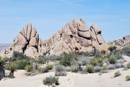 Wir erkunden erst den Campground und gehen dann den Trail zum berühmten "Skull Rock". Klar sind am Rock selber viele Landsleute anzutreffen und jeder macht sein Fotolein, aber seltsamerweise sind wir auf dem Trail immer allein - viele kommen wahrscheinlich direkt von der Straße an den Rock, machen ihr Foto und fahren weiter. Der Trail hat was von der BUGA: so schön führt er zwischen Kakteen und Wüstenpflanzen, Gestein und Kies hindurch, dass man versucht ist zu denken, das hätte jemand so arrangiert. Und dann liegt sie auch schon da: unsere erste (nicht unsere letzte!) Klapperschlange. Irgendwie glauben wir erst jetzt, dass es hier wirklich wilder ist, als "dahoam" und ab jetzt laufen wir etwas zögerlicher und vorsichtiger den kleinen Pfad entlang...!