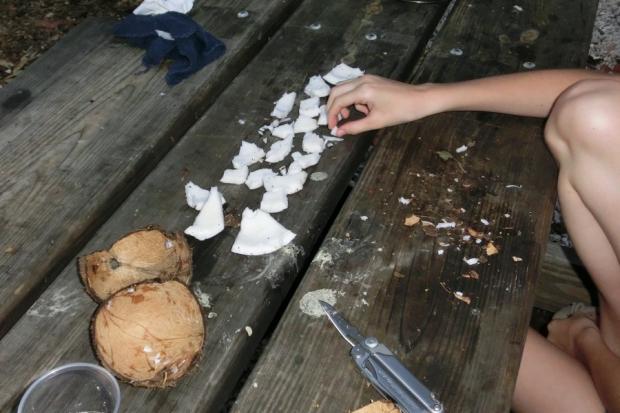 Auf unserer Site hatte ich eine Kokosnuss gefunden (obwohl hier keine Palmen waren). Sie war noch in der „grünen Verpackung”, daher waren alle zunächst etwas skeptisch. Als ich sie aber geschüttelt hatte und man das Wasser darin hörte, war die Begeisterung bei den Kinder groß: das Ding muss geknackt werden! Zum Glück hatte ich den Leatherman dabei, damit konnte man dieses Schalengewebe um die braune Nuss einigermaßen entfernen. Ich wusste gar nicht, dass das so schwer geht, es war sehr schweißtreibend bei der Hitze. Als die Nuss endlich frei lag, wurden Löcher gebohrt, das Wasser getrunken und nach ein paar Schlägen auf einen Stein konnten wir heute einen anderen Nachtisch zu uns nehmen, mal kein Ben&Jerry’s !!!