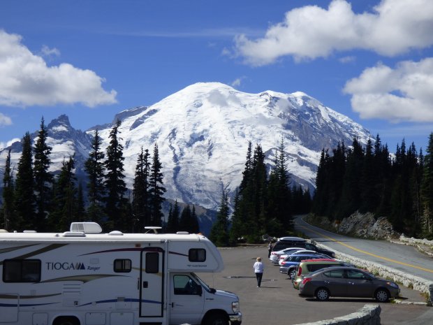 Nach den Metropolen Vancouver und Seattle geht es heute weiter über die #410 zum Mount Rainer National Park. Es sollte ein Highlight der Tour werden. Seit unserem ersten Tag in Vancouver waren wir bereits von der Sonne verwöhnt, so auch heute. Schon wenige Meilen nachdem wir Seattle verlassen hatten tauchte im Hintergrund der schneebedeckte Mount Rainer auf. Unser Ziel war das Sunrise Visitor Center. Die kurvige Anfahrt lohnt sich! Der Mount Rainer präsentierte sich bei strahlend blauem Himmel von seiner besten Seite. Gleich hinter dem Visitor Center haben wir einen herrlich gelegenen Picknickplatz gefunden und die Sonnenstrahlen genossen. Das Traumpanorama ist unbeschreiblich.