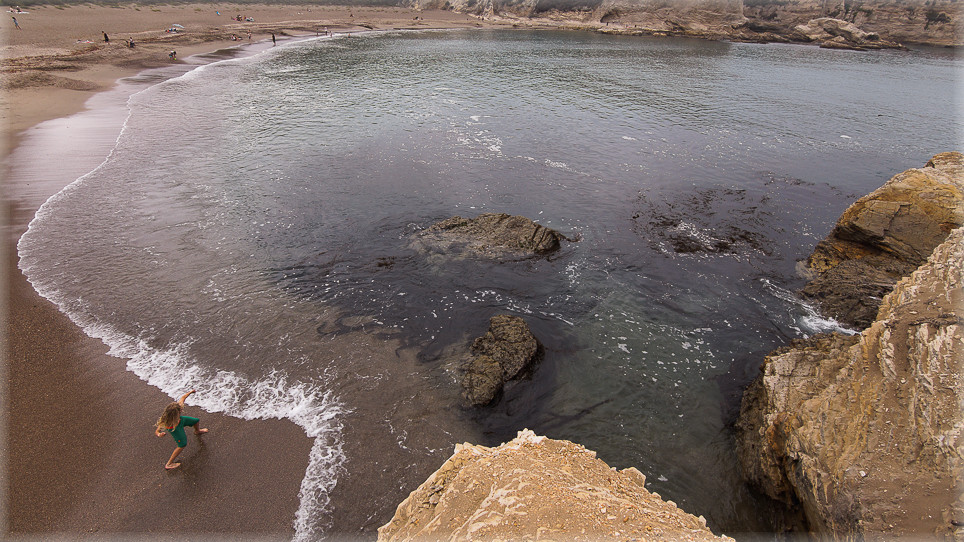 Diesmal ist es unsere Große, mit der ich zusammen auf den Felsen klettere, um dort oben ein paar Fotos von den aufschäumenden Wogen zu machen. Sie donnern mit Macht gegen die farbenprächtigen Klippen, vor allem hier auf der Westseite des Kletterfelsens.