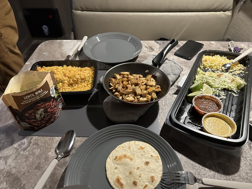 Kurz vor dem Ziel kaufen wir wieder in einem Mini Supermarkt in Springerville ein. Für zwei Leute ist es oft gar nicht so einfach ein gutes Essen zu finden, da ja die Größen der Nahrungsmittel immer riesig sind. Aber es gibt was cooles: Alle Zutaten für mexikanische Tacos, ideal für zwei Personen. Mit noch etwas Reis und Bohnen haben wir ein tolles Abendessen in Aussicht.