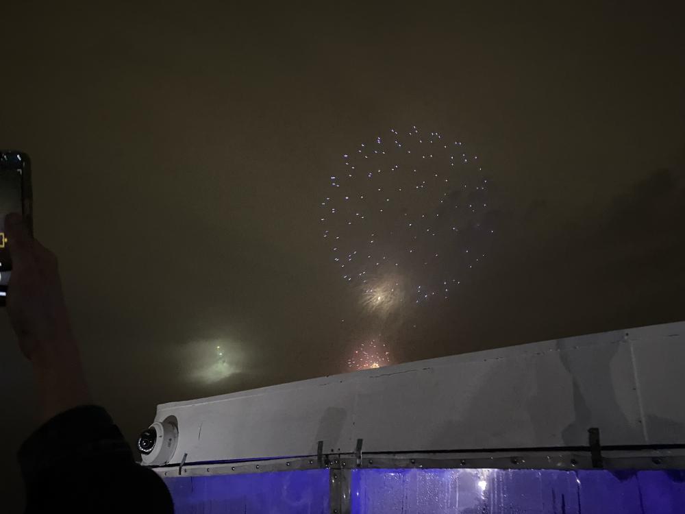 Wir unterhalten uns ganz nett mit den Leuten an unserem Tisch und die Zeit verfliegt regelrecht bis Mitternacht. Alle Gäste wollen nun raus auf das Oberdeck (was entsprechend voll ist) – wir stehen tatsächlich mit dem kleinen Boot soooo nah an der Freiheitsstatue und erleben den Jahreswechsel und das Feuerwerk dort aus direkter Nähe. Die Bilder sind aber auch nochmal ein Beweis für das schlechte Wetter