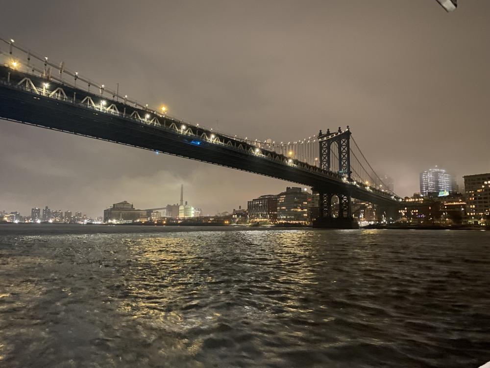 Pünktlich zum Boarding sind wir am Pier auf dem East River und wie es der Zufall will sitzen wir tatsächlich an einem Tisch mit anderen deutschen Gästen. Die amerikanischen Gäste nehmen die Silvesternacht auf jedenfall deutlich ernster und sind sehr schick gekleidet. Das Boarding ist schnell erledigt und wir schippern los und (Ziel ist die Freiheitsstatue) und trotz des Nebels genießen wir den Blick vom Außendeck auf die Skyline und die Manhattan und Brooklyn Bridge