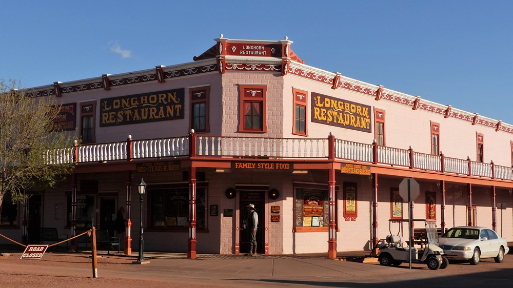Am spaeten nachmittag treibt uns dann der Hunger raus, ausserdem wollen wir ja was sehen. Die Wolken haben sich verzogen und die Sonne scheint. Tombstone gleicht trotzdem einer Ghost Town. Staubwolken fegen durch die Strassen, trockene Grasbueschel und Muelltonnendeckel fliegen umher, kaum Menschen. Aber hinter den Schwingtueren, da ist Leben.