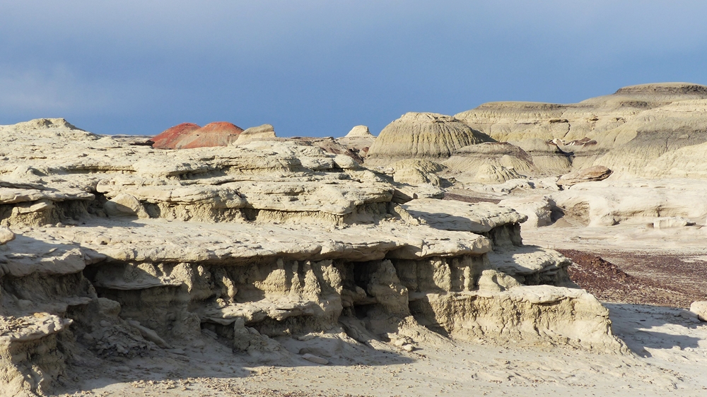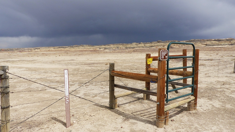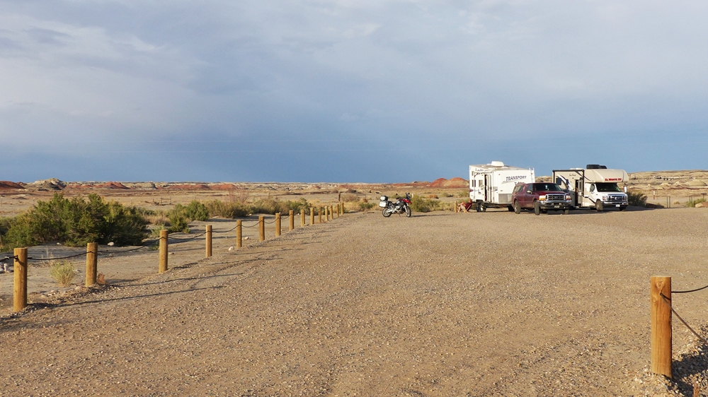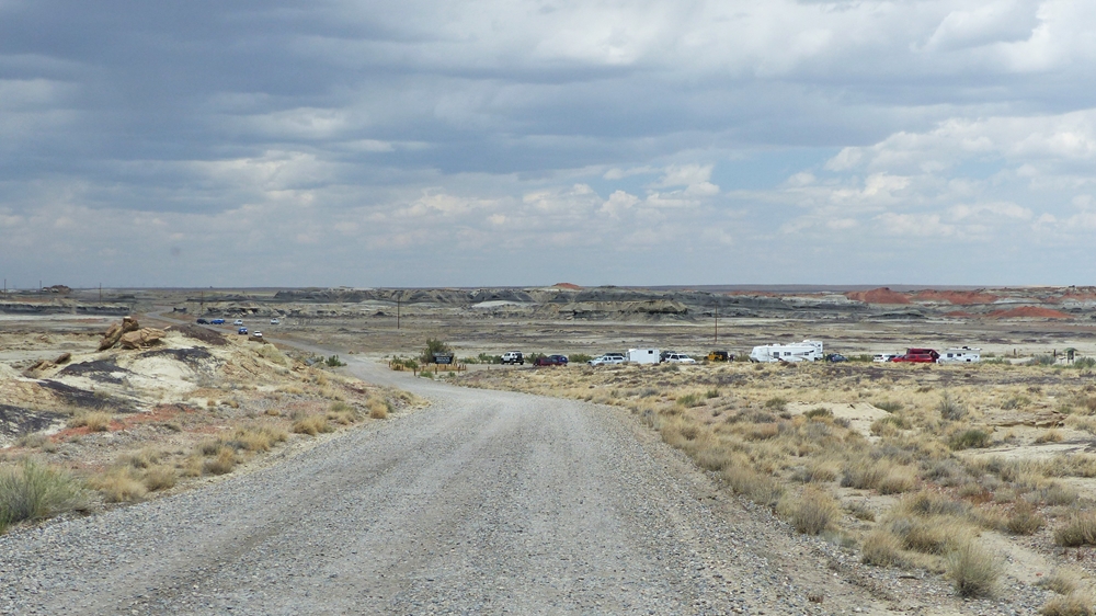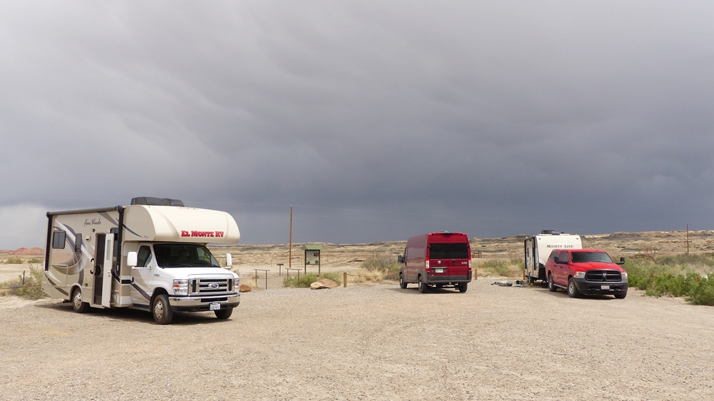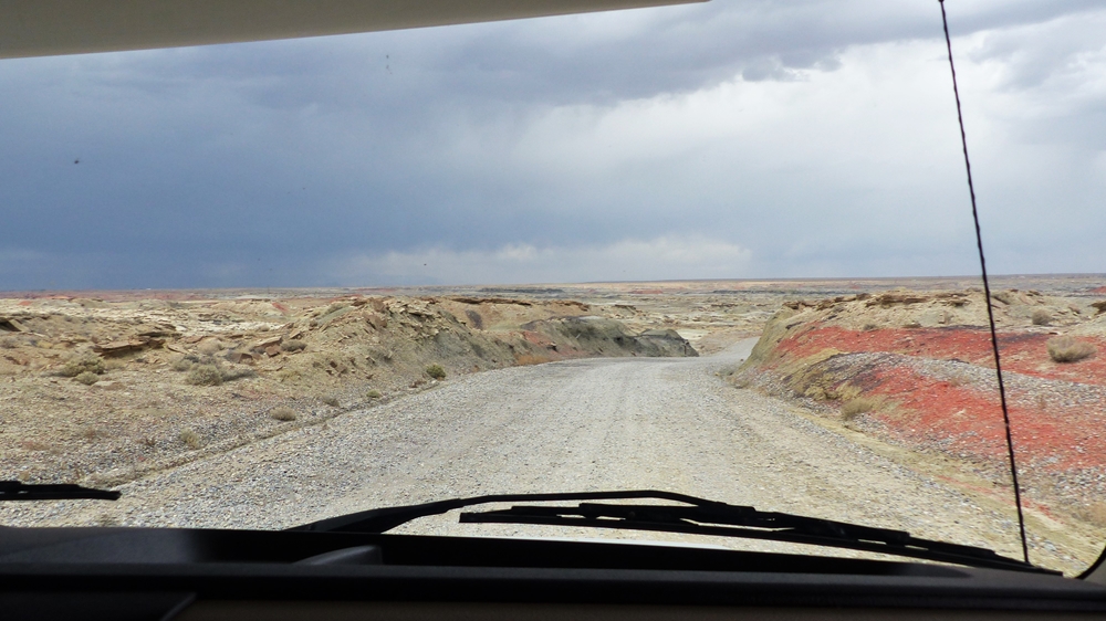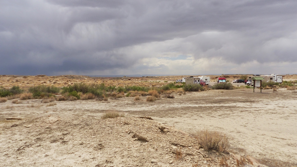 Die Anfahrt ins Bisti Badland gleicht bereits einer Fahrt auf einem anderen Planeten. Unser Navi ist etwas gestoert, es will uns abbiegen lassen, wo es keine Abbiegung gibt, sondern nur ein Zaun. Dummerweise habe ich die Maps3D App nicht rechtzeitig und nicht richtig auf dem Handy geladen. Die offline-map zeigt zwar an, wo wir sind, aber das Teilstueck der Karte, wo wir abbiegen muessen, wird nicht angezeigt. Also fahren wir solange weiter, bis wir zu der Abfahrt kommen, wo auch das Hinweisschild steht. Die knapp 3 mls lange Gravelroad bis zum Parklatz und Trailhead ist ganz ok, vermutlich wurde sie vor kurzem geschoben. Von einer kleinen Anhoehe sieht man ein paar Autos und Camper dort stehen. Etwas spooky ist aber die Farbe des Himmels am Horizont. Da braut sich was zusammen und das gefaellt uns garnicht. Dazu faengt es heftig zu stuermen an. Beim Aussteigen bekomme ich gleich eine volle Ladung Sand ins Gesicht, so dass ich im ersten Moment ueberhaupt nichts mehr sehe. Einige Besucher, die mit den PKWs da sind, raeumen das Feld und es es bleiben nur 5 Camper zurueck. Ein Glueck sind wir nicht alleine hier.