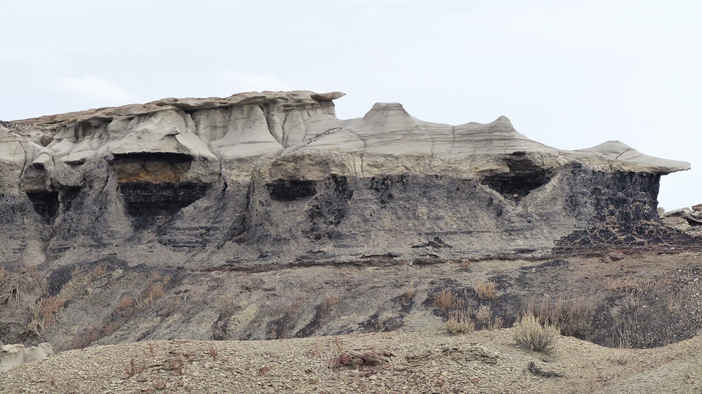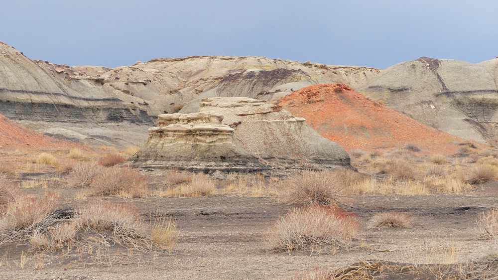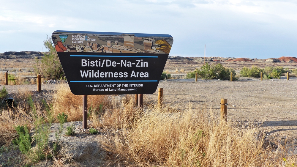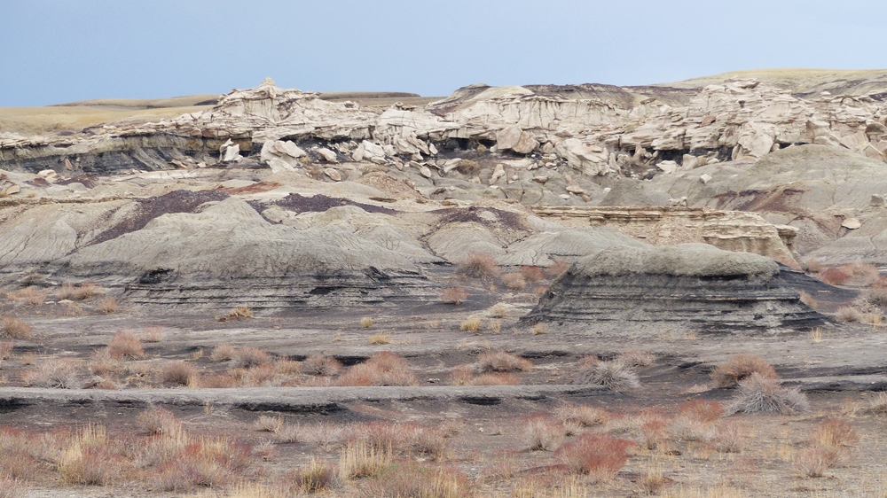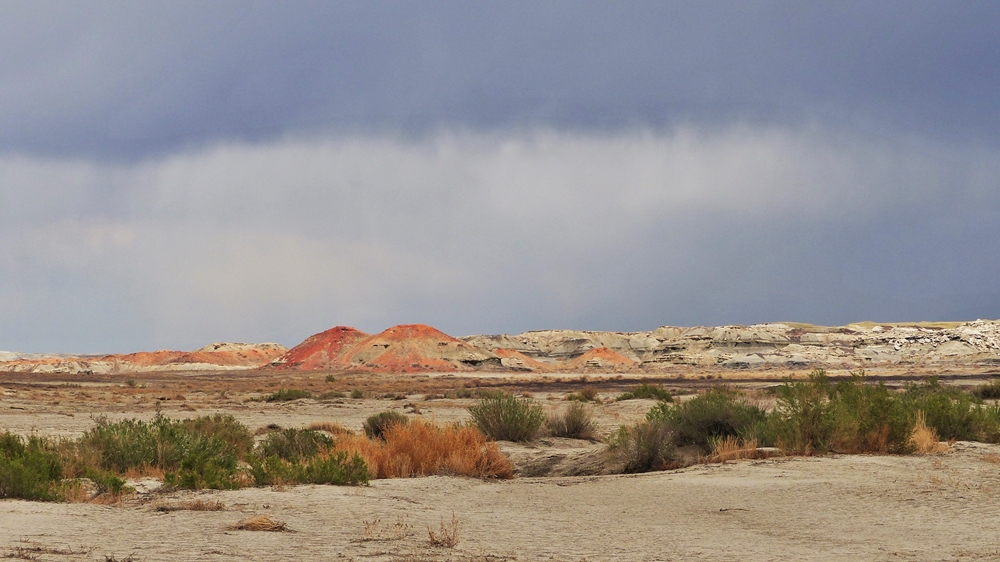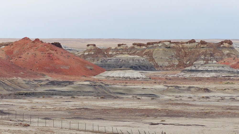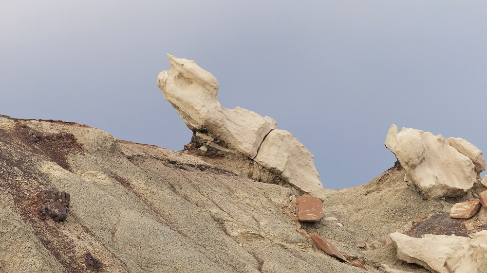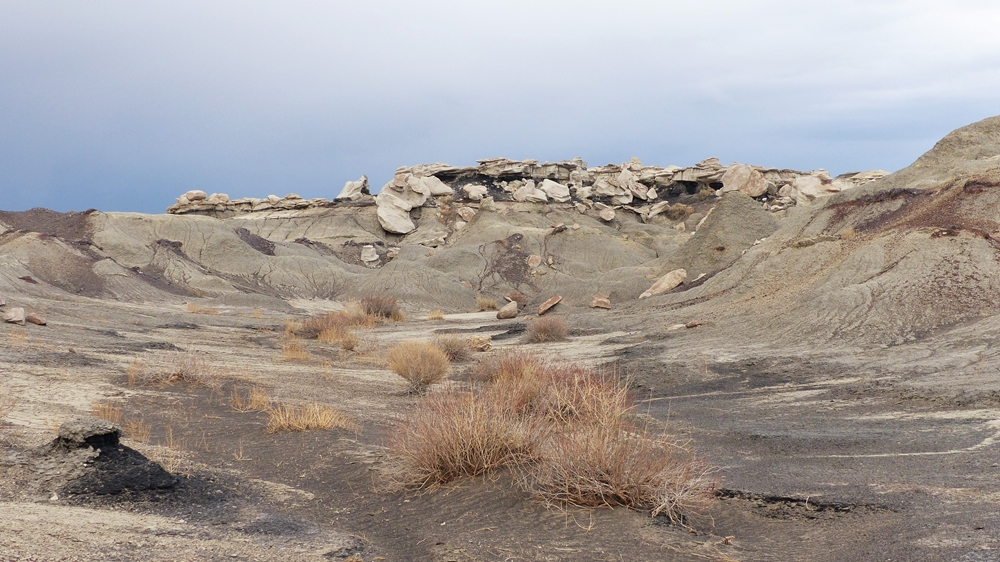 Die Anfahrt ins Bisti Badland gleicht bereits einer Fahrt auf einem anderen Planeten. Unser Navi ist etwas gestoert, es will uns abbiegen lassen, wo es keine Abbiegung gibt, sondern nur ein Zaun. Dummerweise habe ich die Maps3D App nicht rechtzeitig und nicht richtig auf dem Handy geladen. Die offline-map zeigt zwar an, wo wir sind, aber das Teilstueck der Karte, wo wir abbiegen muessen, wird nicht angezeigt. Also fahren wir solange weiter, bis wir zu der Abfahrt kommen, wo auch das Hinweisschild steht. Die knapp 3 mls lange Gravelroad bis zum Parklatz und Trailhead ist ganz ok, vermutlich wurde sie vor kurzem geschoben. Von einer kleinen Anhoehe sieht man ein paar Autos und Camper dort stehen. Etwas spooky ist aber die Farbe des Himmels am Horizont. Da braut sich was zusammen und das gefaellt uns garnicht. Dazu faengt es heftig zu stuermen an. Beim Aussteigen bekomme ich gleich eine volle Ladung Sand ins Gesicht, so dass ich im ersten Moment ueberhaupt nichts mehr sehe. Einige Besucher, die mit den PKWs da sind, raeumen das Feld und es es bleiben nur 5 Camper zurueck. Ein Glueck sind wir nicht alleine hier.