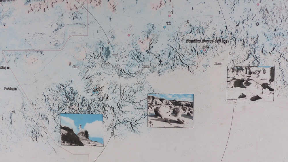 Wir ueberlegen nicht lange, ziehen uns warm an und ziehen los zu einer Runde durch diese skurrile Landschaft. Das Licht ist schoen. Fuer die grosse Loop ist es zu spaet, erst recht bei diesen Wetterbedingungen. Wir wollen aber zumindest einen kleinen Einblick in diese Mondlandschaft bekommen. Notfalls muessen wir schnell zuruecklaufen, sollte der Regen doch noch kommen. Vorsichtshalber fotographiere ich an der Infotafel die kleine Map ab, man weiss ja nie.