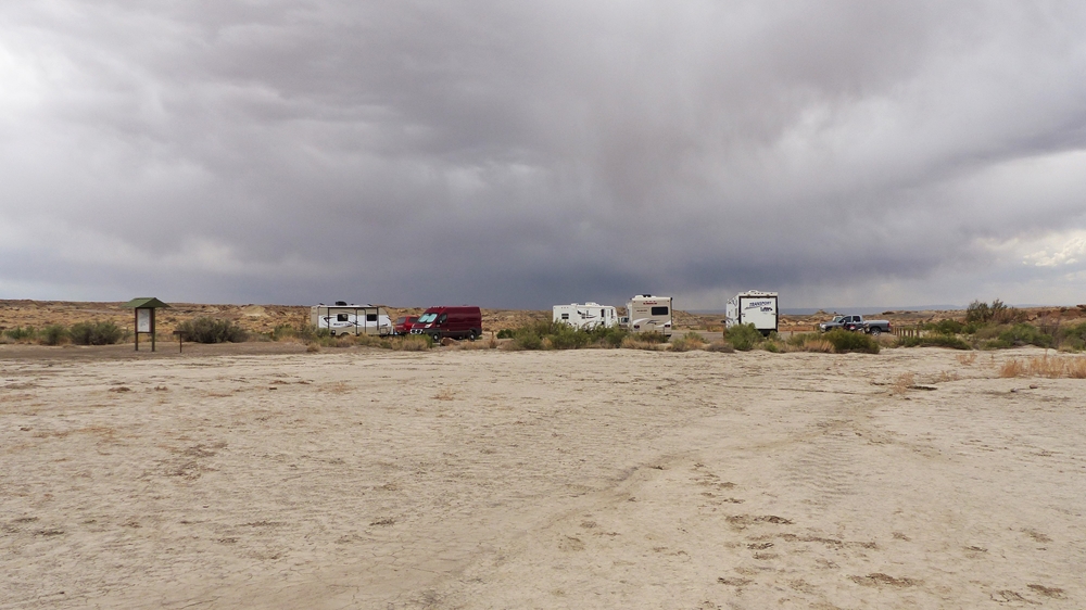 Wir stellen uns ziemlich nah an den Trailer neben uns, als Windschutz. Aufgrund unserer besorgten Gesichter meint unser Nachbar, es sei noch alles im gruenen Bereich. Erst wenn er die Flucht ergreift, sollten wir ihm folgen. Ok, ....sehr beruhigend... zumindest etwas. Ich scanne vorsichtshalber die Umgebung ab und ueberlege, wohin wir denn fluechten sollen, wenn dann "das Wasser" kommt. Zu beiden Seiten des Parkplatzes gibt es leichte Erhoehungen entlang der Gravelroad, dort koennten wir zumindest etwas hoeher stehen, im Notfall. Wir muessen dabei sofort an unseren letzten Aufenthalt im Goblin Valley denken, wo wir rund um das Womo die Wassermassen sahen.